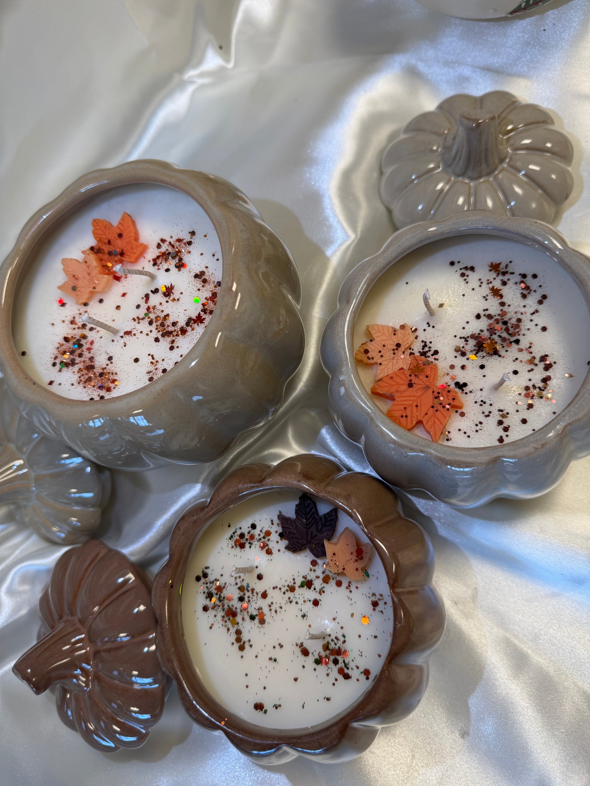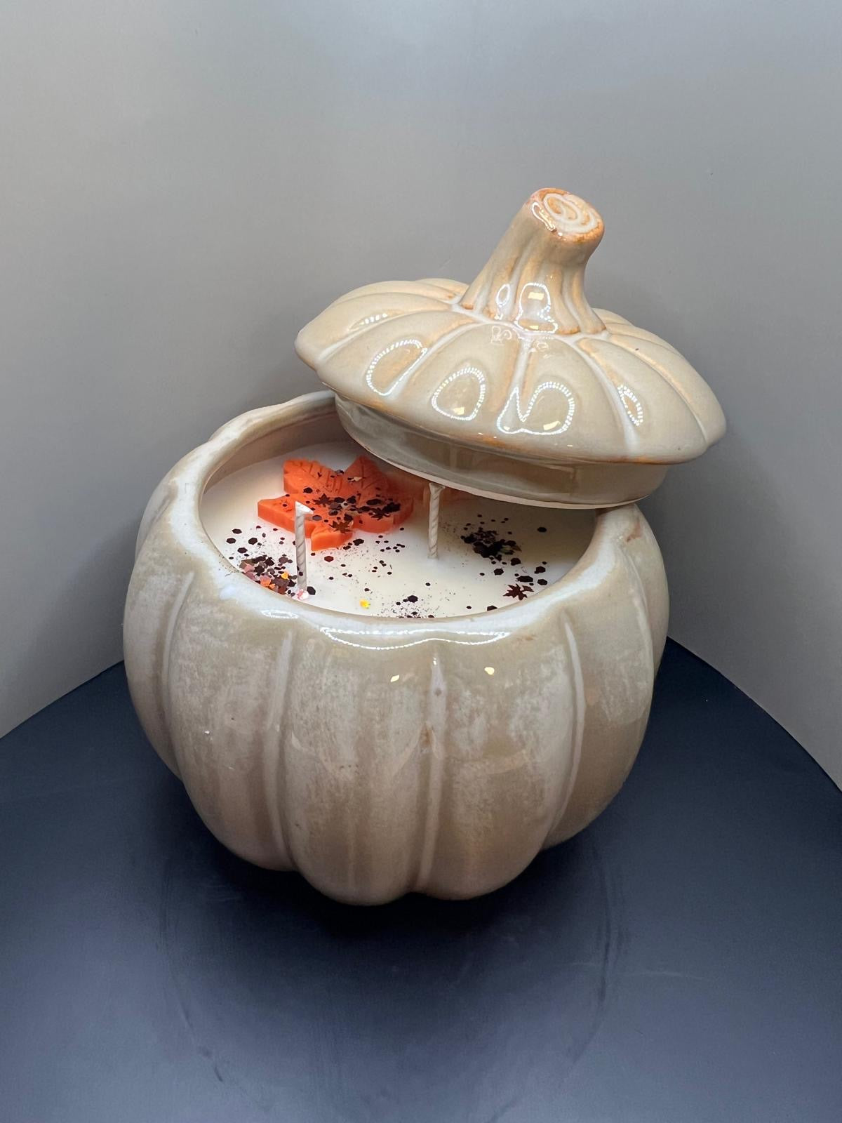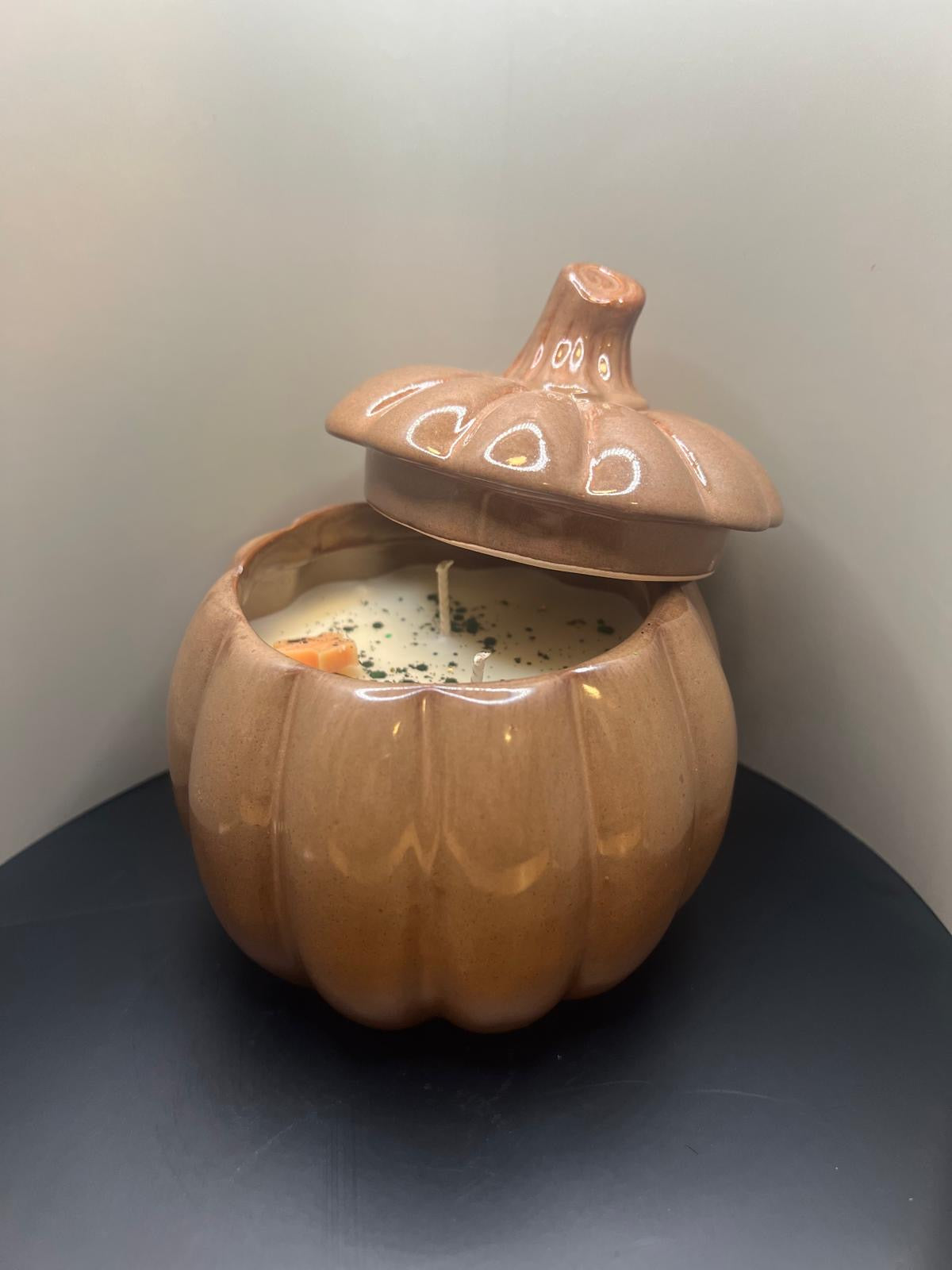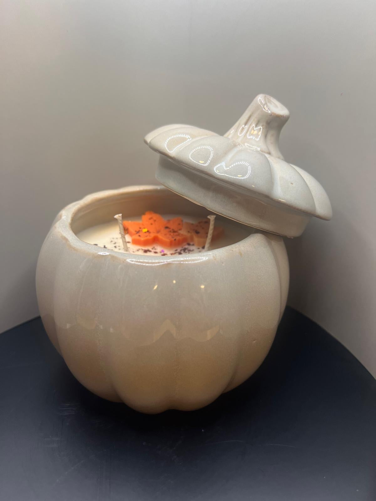 Vang de warmte en gezelligheid van de herfst met onze Autumn Glow kaarsen, gegoten in een keramische pompoenpot met deksel.